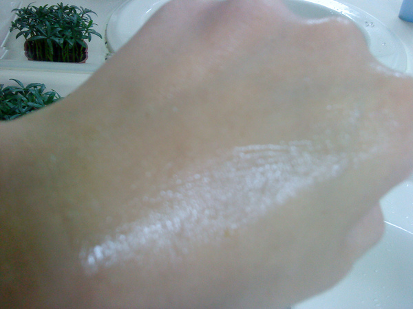 擠出適量的潔顏果晶,輕輕以按摩方式磨開,感覺它的顆粒十分的細緻,不像一般磨沙,感覺很像砂紙那樣令人傻眼
