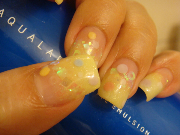 也就是把粉雕與亮片包在甲片內,我好喜歡今天的點點風與正方形亮片的搭配,