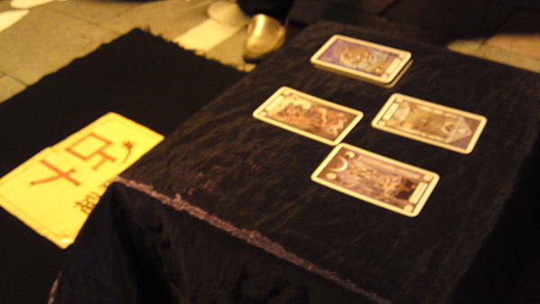 (地上有塊黑布上面寫著占卜,工具就是很簡單的兩副牌。墊高箱。看起來神秘的桌布)